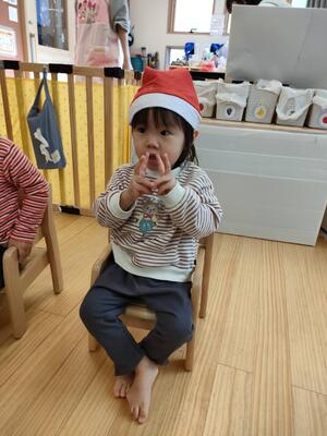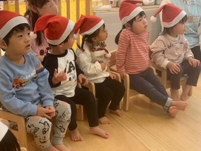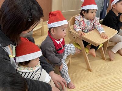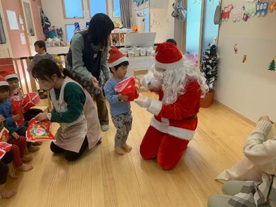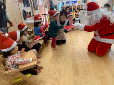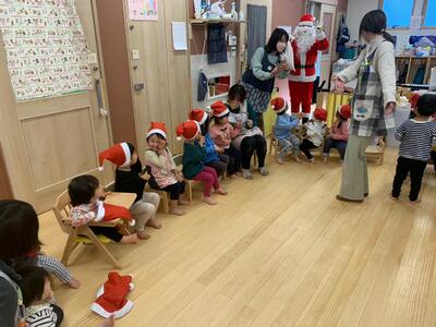 本物のサンタさんを見て、目を丸くして驚いた表情、怖くて泣いてしまうお友達、「さんたさんだ!」と大喜びし満面の笑みを見せてくれるお友達等、一人ひとり違った反応をしていました。
