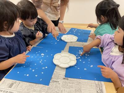あめ組さんは、指スタンプで雪作り